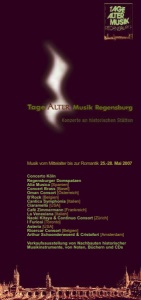 Concerto Köln Regensburger Domspatzen Alia Musica [Spanien] Concert Brass [Basel] Oman Consort [Österreich] B’Rock [Belgien] Cantica Symphonia [Italien] Ciaramella [USA] Café Zimmermann [Frankreich] La Venexiana [Italien] Naoki Kitaya & Continuo Consort [Zürich] I Furiosi [Toronto] Asteria [USA] Ricercar Consort [Belgien] Arthur Schoonderwoerd & Cristofori [Amsterdam] Verkaufsausstellung von Nachbauten historischer Musikinstrumente, von Noten, Büchern und CDs Musik vomMittelalter bis zur Romantik 25.-28. Mai 2007
