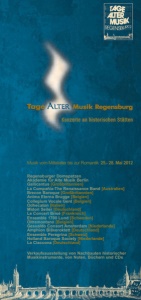 Regensburger Domspatzen Akademie für Alte Musik Berlin Gallicantus [Großbritannien] La Compañia-The Renaissance Band [Australien] Brecon Baroque [Großbritannien] Anima Eterna Brugge [Belgien] Collegium Vocale Gent [Belgien] Odhecaton [Italien] Midori Seiler [Deutschland] Le Concert Brisé [Frankreich] Ensemble 1700 Lund [Schweden] Oltremontano [Belgien] Gesualdo Consort Amsterdam [Niederlande] Amphion Bläseroktett [Deutschland] Ensemble Peregrina [Schweiz] Holland Baroque Society [Niederlande] La Ciaccona [Deutschland] Verkaufsausstellung von Nachbauten historischer Musikinstrumente, von Noten, Büchern und CDs Musik vomMittelalter bis zur Romantik 25.- 28. Mai 2012
