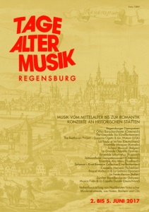 Preis: 7,00 € MUSIK VOM MITTELALTER BIS ZUR ROMANTIK KONZERTE AN HISTORISCHEN STÄTTEN Regensburger Domspatzen L’ Orfeo Barockorchester (Österreich) The Gesualdo Six (Großbritannien) The Beethoven Project – Susanna Ogata & Ian Watson (USA) Les haulz et les bas (Deutschland) Ensemble Masques (Kanada) Scherzi Musicali (Belgien) La Grande Chapelle (Spanien) Ensemble Labyrinthus (Russland) Schwanthaler Trompetenconsort (Österreich) Ensemble Alia Mens (Frankreich) Solomon’s Knot Baroque Collective (Großbritannien) Cappella Mariana (Tschechien) Raquel Andueza & La Galanía (Spanien) La Fonte Musica (Italien) Zürcher Barockorchester (Schweiz) Musica Fiata & La Capella Ducale (Deutschland) Verkaufsausstellung von Nachbauten historischer Musikinstrumente, von Noten, Büchern und CDs 2. BIS 5. JUNI 2017