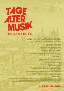Preis: 10,00 € 17. BIS 20. MAI 2024 MUSIK VOM MITTELALTER BIS ZUR KLASSIK KONZERTE AN HISTORISCHEN STÄTTEN Regensburger Domspatzen Musica Florea Prag (Tschechien) The Marian Consort (Großbritannien) The Illyria Consort (Großbritannien) Les Muffatti – Bart Jacobs (Belgien) La Petite Écurie (Niederlande) Les Ombres – Théotime Langlois de Swarte (Frankreich) Ensemble La Chimera (Italien) I Fedeli (Schweiz) Ensemble Voz Latina (Italien) Vokalensemble NovoCanto (Österreich) The Binchois Consort (Großbritannien) Fieri Consort (Großbritannien) Ensemble ApotropaïK (Frankreich) Le Consort (Frankreich) Kölner Akademie (Deutschland) – Tomasz Ritter (Polen) Arsenale Sonoro – Francesca Aspromonte (Italien) Quicksilver (USA) Perrine Devillers & Ariel Abramovich (Frankreich /Argentinien) Constantinople (Kanada) – Marco Beasley (Italien) Chor & Orchester der Capella Cracoviensis (Polen) BEIPROGRAMM: Große internationale Verkaufsausstellung von Nachbauten historischer Musikinstrumente, von Noten, Büchern und CDs La Pellegrina – Die Florentiner Intermedien (1589) Tagung in Zusammenarbeit mit dem Institut für Musikwissenschaft der Universität Regensburg Gesprächskonzert: Hautboisten-Ensemble La Petite Écurie · Gesprächskonzert: Flötenbauer Guido M. Klemisch Kurstag Alte Musik mit Marco Beasley